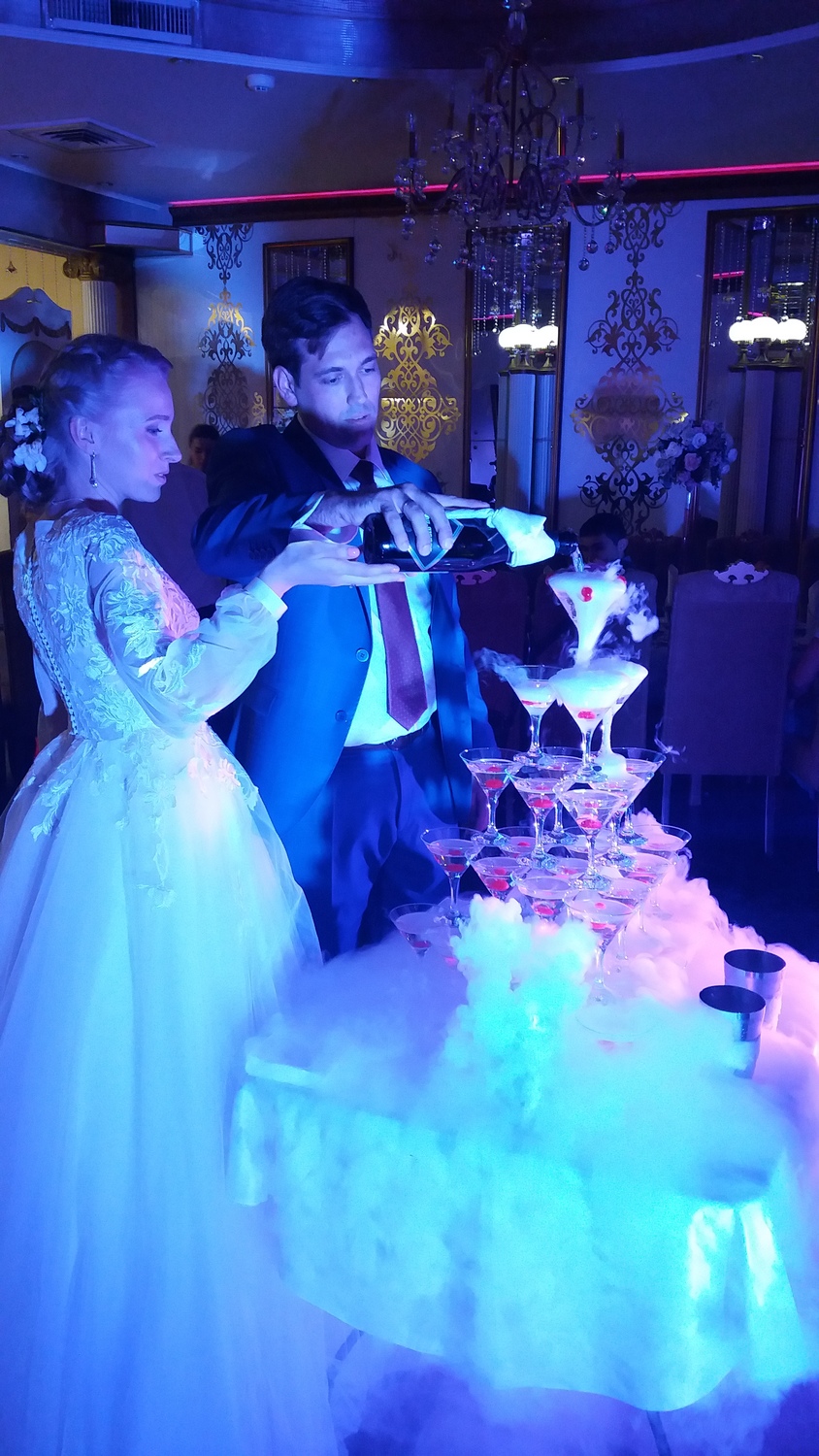 В стоимость входит: бокалы, доставка, установка, разлив игристого, украшение коктейльной вишней, физалисом и эффект дыма.